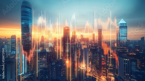 © Ytnart, Fototapeta premium A stunning skyline view at sunset, featuring modern skyscrapers illuminated by vibrant light, representing urban growth and innovation in a bustling city.