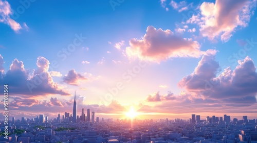 © Blue Ha Waii - AI, Fototapeta premium A stunning skyline view at sunset with vibrant clouds illuminating the horizon, showcasing urban beauty and tranquility.