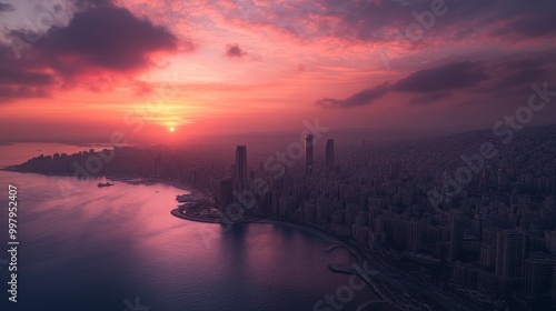 © Elkhan Babayev, Fototapeta premium A stunning spectacle of Beirut city against the backdrop of a captivating sunset in Lebanon.