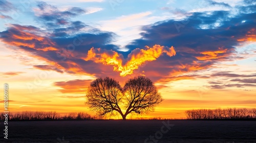 Fototapeta premium A stunning stock photo capturing the picturesque silhouette of a heartshaped tree against a breathtaking sunset backdrop, creating a romantic and serene atmosphere.