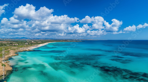 © INVO, Obraz premium A stunning summer scene where the azure ocean meets the clear blue sky, creating an endless expanse of water under radiant sunlight. White fluffy clouds float gracefully above, enhancing the serene