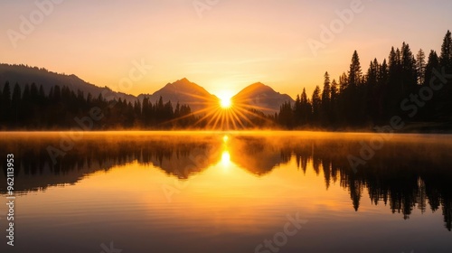 © amankris99, Fototapeta premium A stunning sunrise over a tranquil lake, reflecting mountains and trees, creating a serene atmosphere in nature.