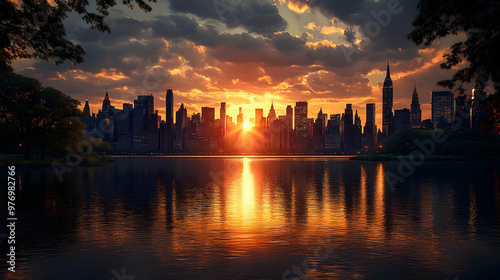 © Siasart Stock, Fototapeta premium A stunning sunrise over the New York City skyline, with the sun peeking through the clouds and reflecting off the water.