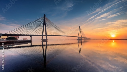 Obraz premium a stunning sunrise view of a cable stayed bridge reflecting on calm water