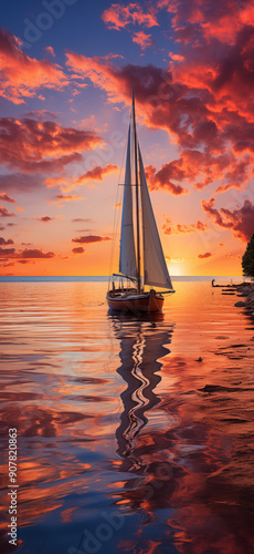 © amidsummersicecr, Fototapeta premium A Stunning Sunset And A Sailboat, Perfect For Mobile Phone Wallpaper