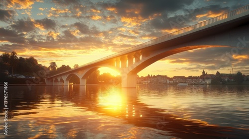 Fototapeta premium A stunning sunset illuminates a bridge over calm waters, reflecting vibrant...