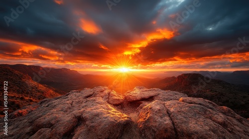 © Larisa AI, Fototapeta premium A stunning sunset illuminates a rugged rocky landscape, casting shadows and highlights across the terrain as the sun dips below the horizon, creating a breathtaking visual spectacle.