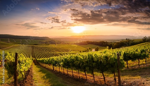 © Marley, Naklejka premium A Stunning Sunset Illuminates A Sprawling Vineyard With Rows Of Lush Green Grapevines Stretching Towards The Horizon In This Picturesque Landscape