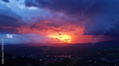 © gentho, Obraz premium A stunning sunset over a valley, with dramatic clouds and vibrant colors illuminating the sky.