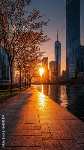 Obraz premium A stunning sunset reflecting on city buildings and waterside path