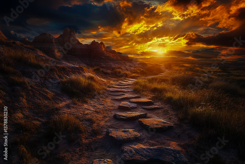 Fototapeta premium A stunning sunset spreads vibrant colors over the rugged land, a winding stone path leading to captivating views.