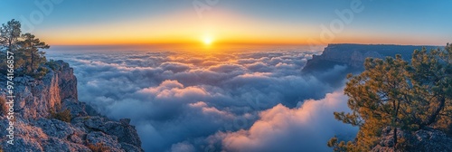 Naklejka premium A stunning sunset view from a mountaintop with layers of clouds below, a...
