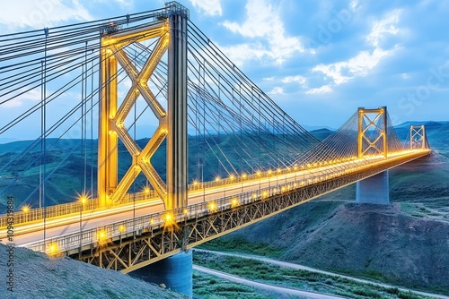 Naklejka premium A stunning suspension bridge illuminated at dusk, showcasing engineering and...