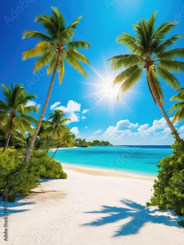 Obraz premium A stunning tropical beach scene featuring palm trees, bright blue water, and...