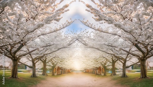 Naklejka premium A stunning tunnel of cherry blossom trees illuminated by soft, warm lights at twilight. The delicate petals create a canopy overhead, reflecting a serene and magical ambiance.
