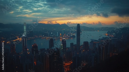 © Natchooda, Fototapeta premium A stunning twilight view of Hong Kong from The Peak, with city lights sparkling against the deepening sky.