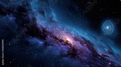© Artemii, Fototapeta premium A stunning, ultra-realistic view of deep space featuring detailed nebulae in rich blues and purples, glowing stars and a distant spiral galaxy.