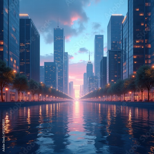 © Makaron, Fototapeta premium A stunning urban skyline at dawn, reflecting in still waters, showcasing modern architecture and a vibrant atmosphere ideal for cityscapes and business visuals.