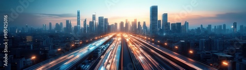 Fototapeta premium A stunning urban skyline at sunset, showcasing tall buildings, a vibrant city atmosphere, and dynamic light trails on the expressway.