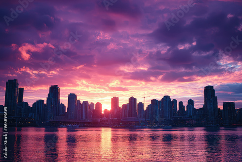 Fototapeta premium A stunning urban skyline with dramatic sunset backdrop, showcasing vibrant colors reflecting on water. scene captures beauty of city life at dusk