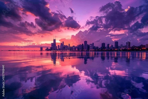 Fototapeta premium A stunning view at sunset, with colorful clouds in the sky and buildings illuminated by the fading light, Big city skyline reflected in water during sunset