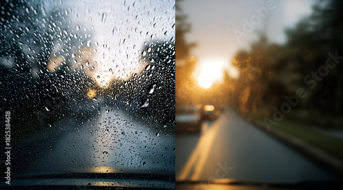 Naklejka premium A stunning view capturing the contrast of driving through rain and sunshine,...