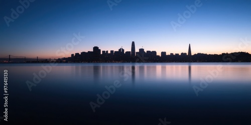 Fototapeta premium A stunning view of a city skyline at dusk with the sky painted in gradient colors, reflecting perfectly onto the calm water below, capturing an urban serenity and peace.
