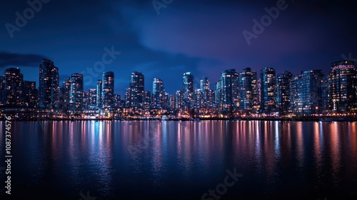 © Seak, Obraz premium A stunning view of a city skyline illuminated at night