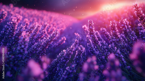 © Shahzadi Studio, Naklejka premium A stunning view of a field of lavender in full bloom, with rows of purple flowers stretching into the distance and a soft breeze creating gentle waves, evoking a sense of calm and tranquility.
