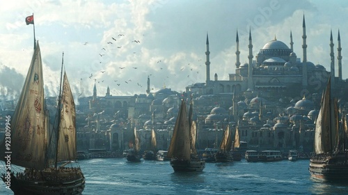 © Irina Ukrainets, Obraz premium A stunning view of a historic city with sailing boats gliding on the water. The architecture is magnificent with domes and minarets. This image captures a serene moment in time. AI