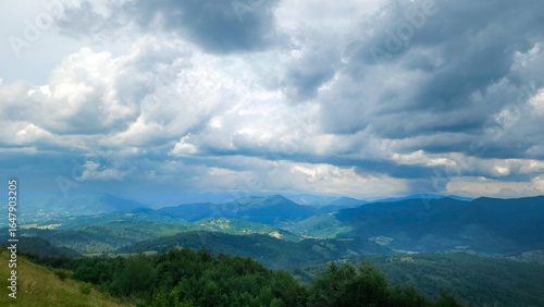 © Vom Baty, Obraz premium A stunning view of a lush mountain range under a bright blue sky with rolling clouds, perfect for travel, nature, and outdoor adventure promotions