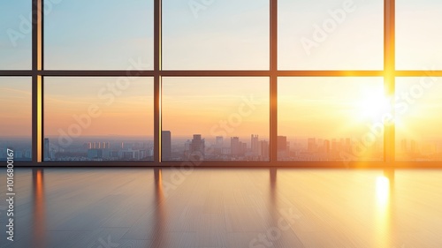 Fototapeta premium A stunning view of a sunset skyline through large windows, highlighting the...