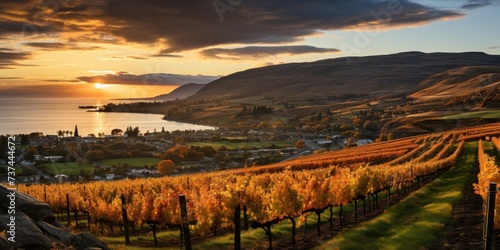 Naklejka premium A stunning view of a vineyard with rows of vibrant grapevines under the warm...