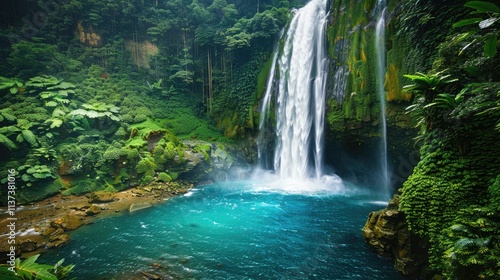 © Nosheen, Fototapeta premium A stunning view of a waterfall cascading into a turquoise pool, surrounded by lush green vegetation