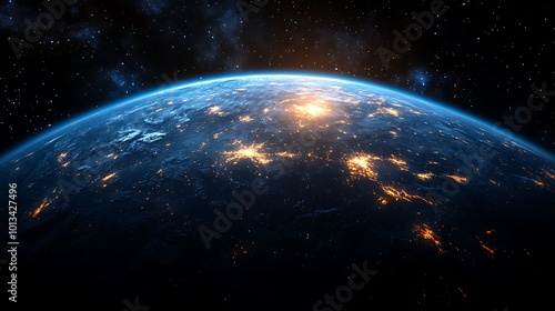 © DIAHIMAGESNEW, Obraz premium A stunning view of Earth at night, with city lights illuminating the planet from space, against a backdrop of stars.