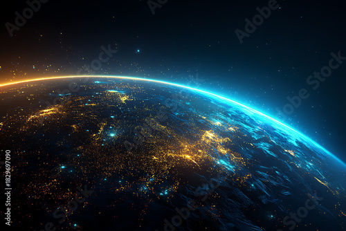 © HomeLander, Obraz premium A stunning view of Earth from space, highlighting illuminated cities and a vibrant atmosphere against a dark cosmic background.