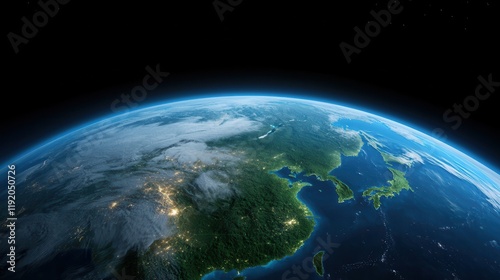 Fototapeta premium A stunning view of Earth from space, showcasing continents, oceans, and atmospheric clouds illuminated by city lights at night.