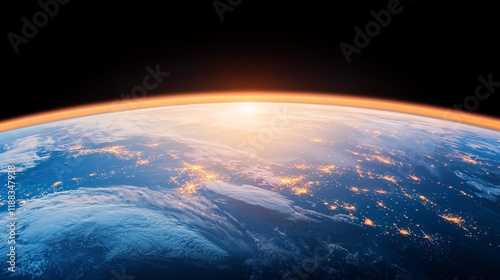© saokaew, Obraz premium A stunning view of Earth from space, showcasing the curvature of the planet and the glow of sunrise over the horizon.