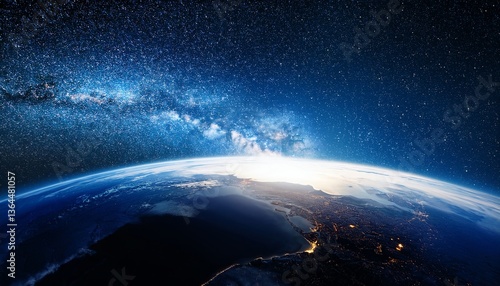 Fototapeta premium A stunning view of Earth from space, showcasing the planet's curvature, atmospheric glow, and a backdrop of countless stars in the universe.