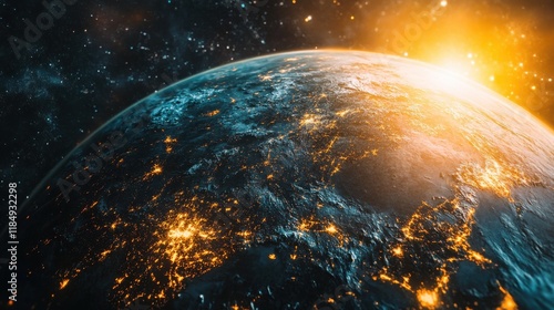 Obraz premium A stunning view of Earth illuminated by city lights against a cosmic...