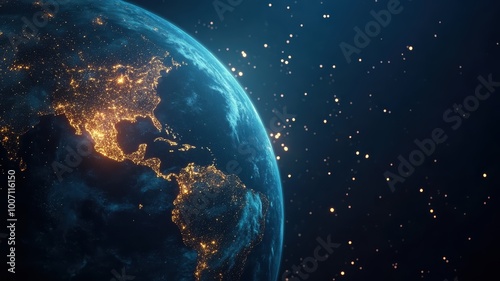 © tanapat, Obraz premium A stunning view of Earth with city lights glowing against a backdrop of starry space.