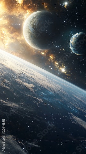 © projek, Fototapeta premium A stunning view of Earth with two planets in the background.