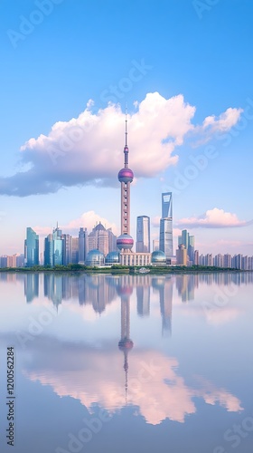 Naklejka premium A stunning view of Shanghai's skyline reflecting on the water under a blue sky.