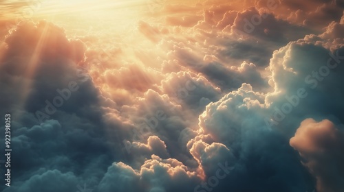 © Ailee Tian, Fototapeta premium A stunning view of the clouds from above, with rays shining through them.