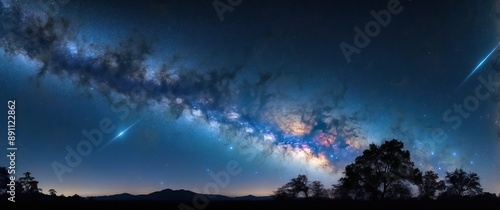 © Qbertstudio, Fototapeta premium A stunning view of the Milky Way, showcasing a star-filled sky over a tranquil landscape, perfect for astronomy and nature enthusiasts.