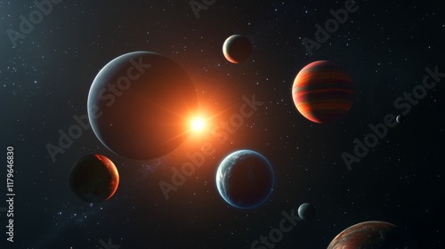 Naklejka premium A stunning visualization of a distant solar system featuring multiple planets orbiting a bright star amidst a starry backdrop.