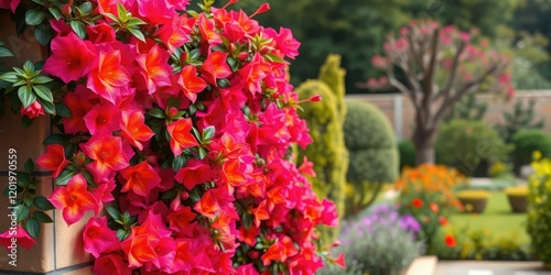 Fototapeta premium A stunning wall covered in bright pink and orange bougainvillea blooms against a tranquil garden backdrop, bougainvillea, purple, natural