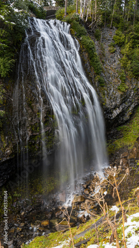 Naklejka premium A stunning waterfall gracefully cascades over rocky cliffs, surrounded by...