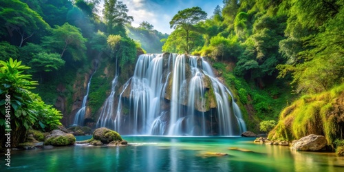 © Nasnunt, Fototapeta premium A stunning waterfall in the serene mountains with lush greenery surrounding it, waterfall, mountains, nature, scenery, serene