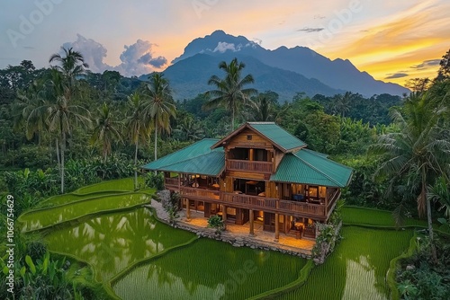 © Rangga Bimantara, Naklejka premium A stunning wooden house surrounded by lush greenery and rice fields, set against a backdrop of mountains at sunset.